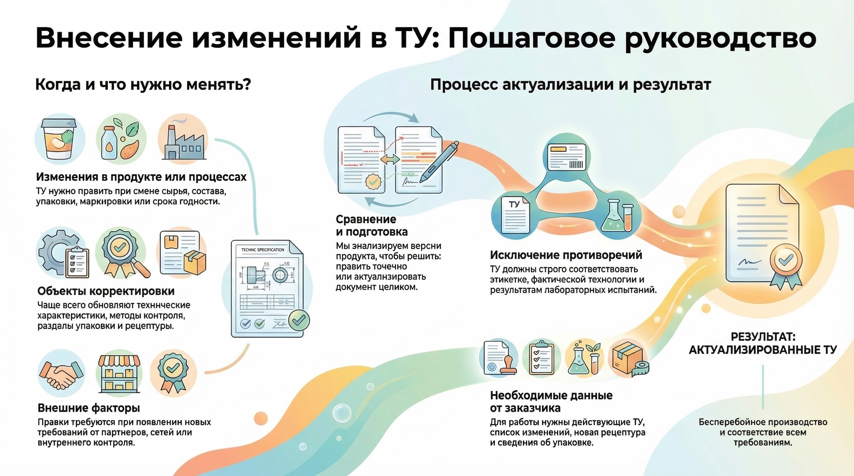 Актуализируем ТУ после изменений в составе, технологии, упаковке, маркировке или сроках хранения и приводим документ к рабочему виду.